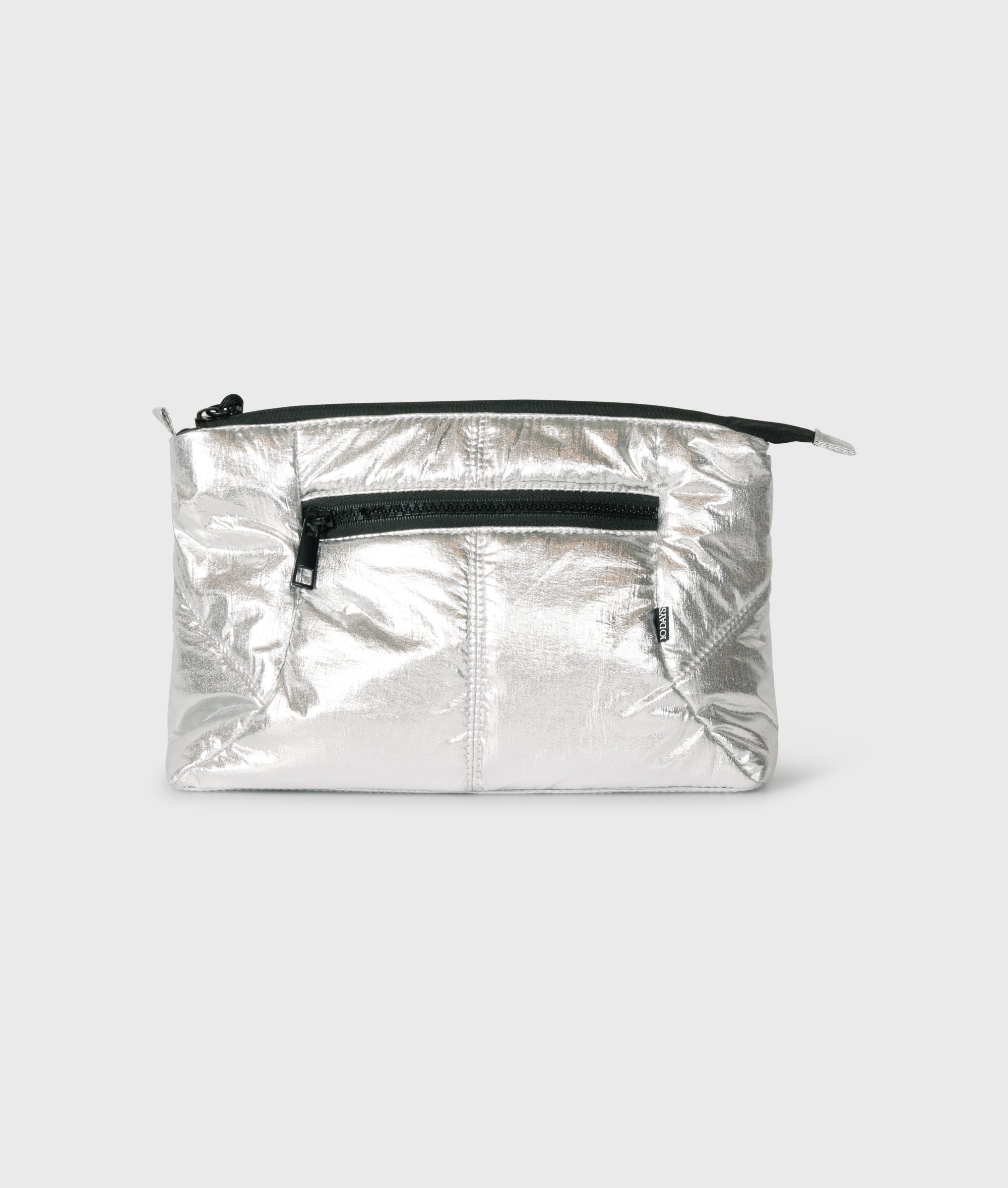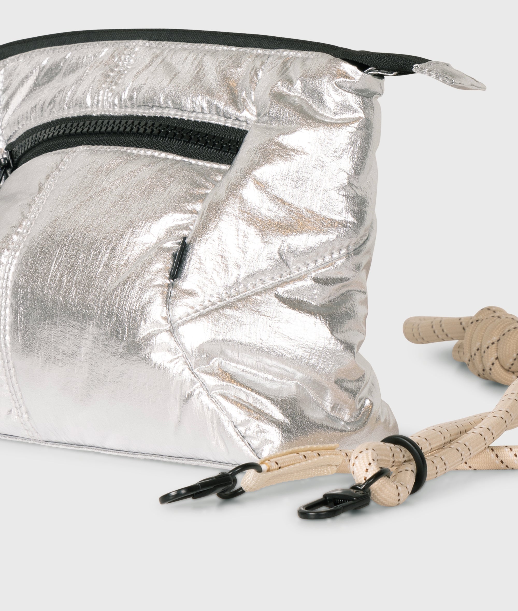 Mini bag, made from supple metallic nylon. Features a zip closure, a lined interior with monogram print, and an adjustable cord with metal details. Bag dimensions: 18 × 25 × 8 cm. Strap length: 140 cm.