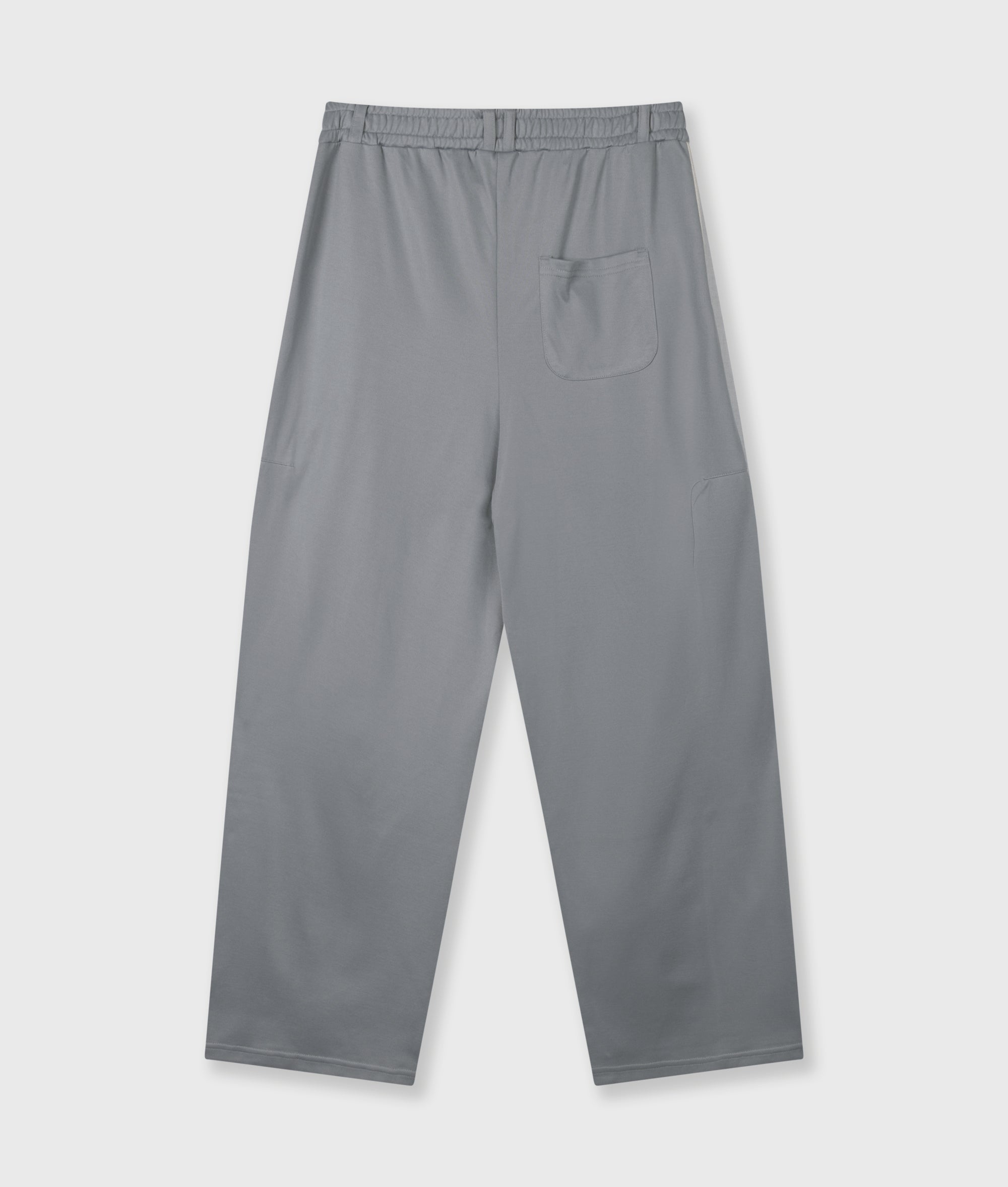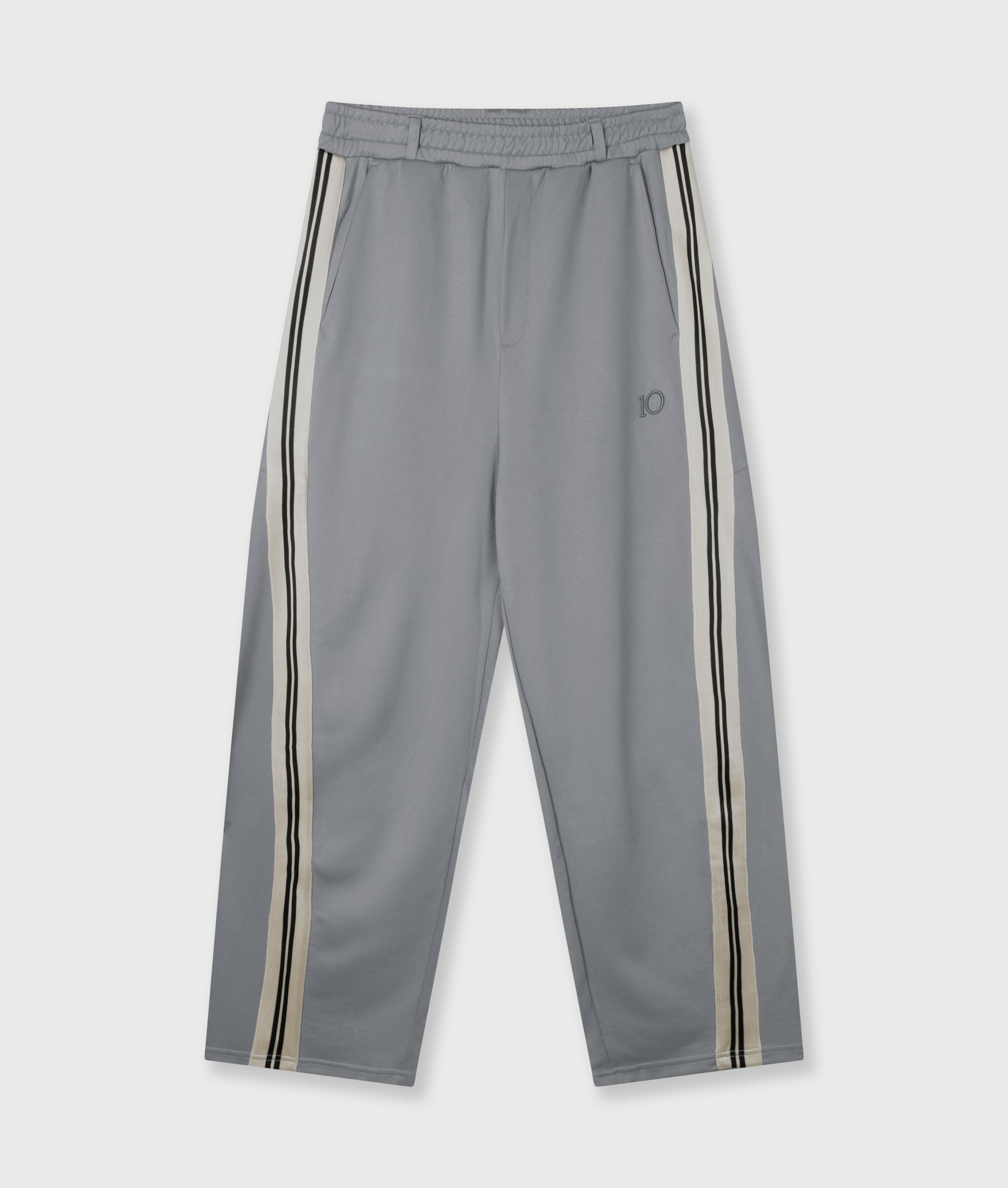 Relaxed fit barrel trousers, made from smooth cotton and polyester blend. Features an elastic waistband with belt loops, side pockets, tape details, a '10' monogram relief embroidery below the left pocket, and a patch pocket at the back.