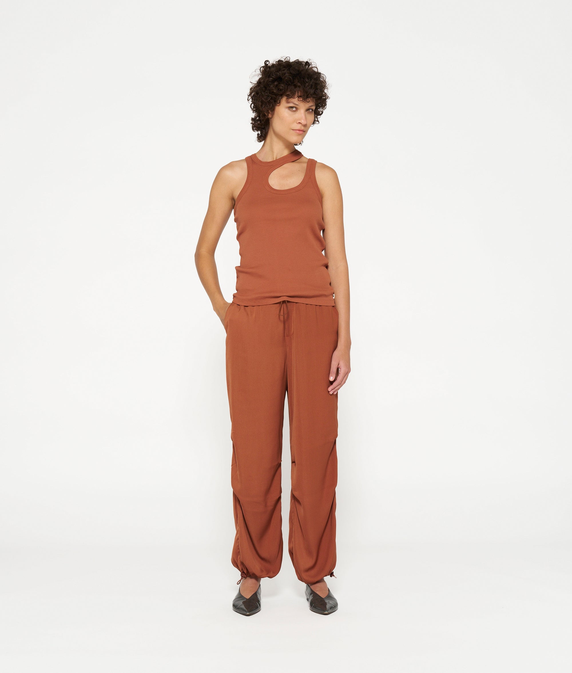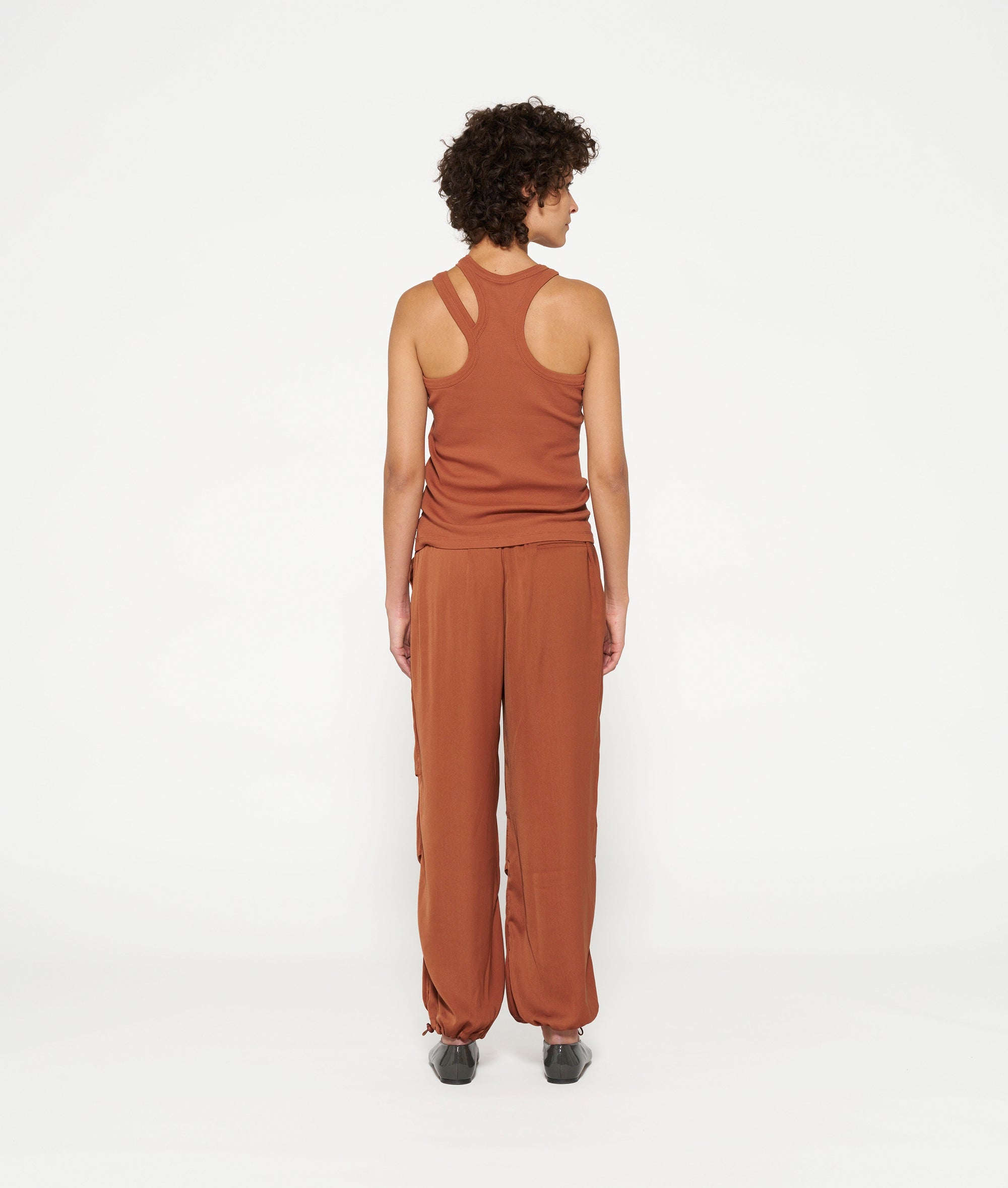 Slim fit cut out tank top, made of cotton. Features ribbed edges and a mini stripes logo at the bottom of the left side seam.