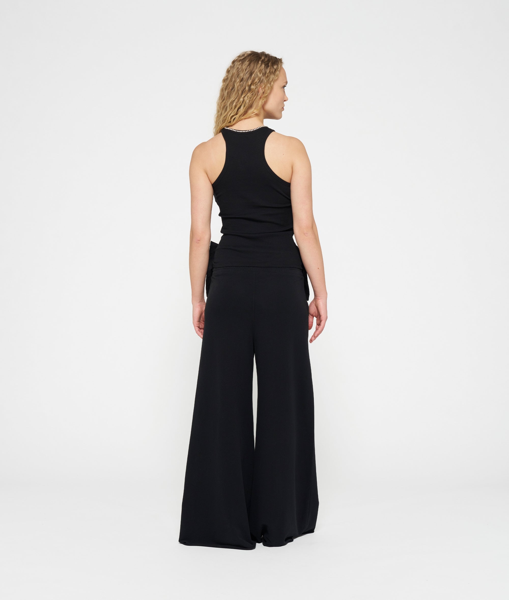 Relaxed fit wide leg joggers, made from soft cotton babyfleece. Featuring an elasticated waistband with cotton poplin bow at the front, slanted slit pockets, raw edge leg hems and a '10' monogram embroidery below the left slit pocket.