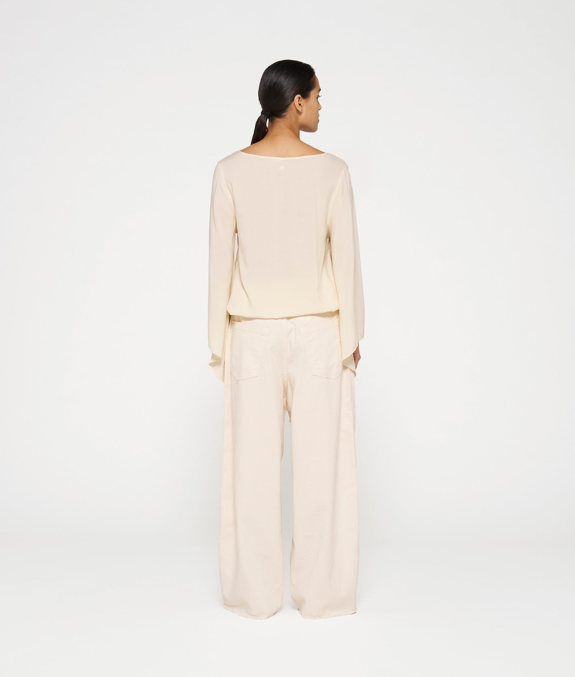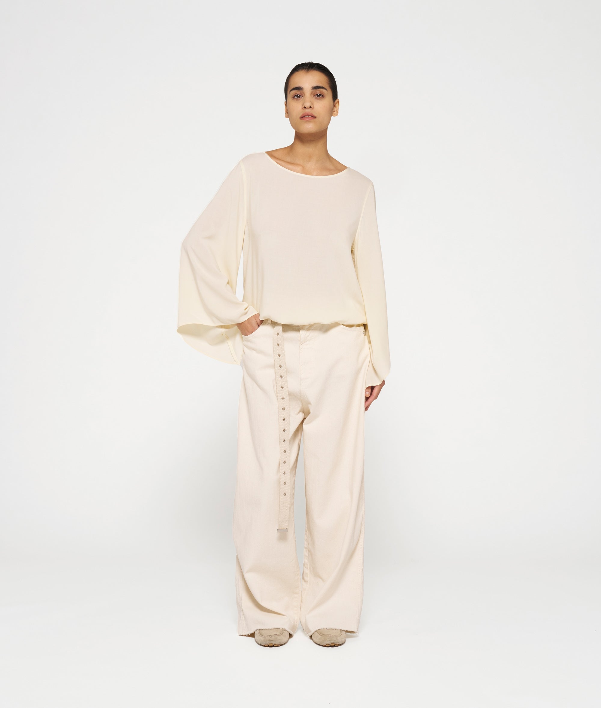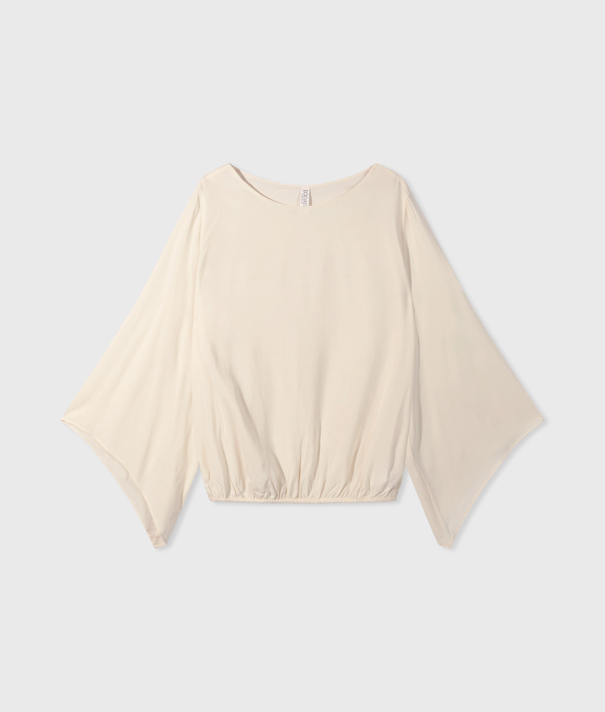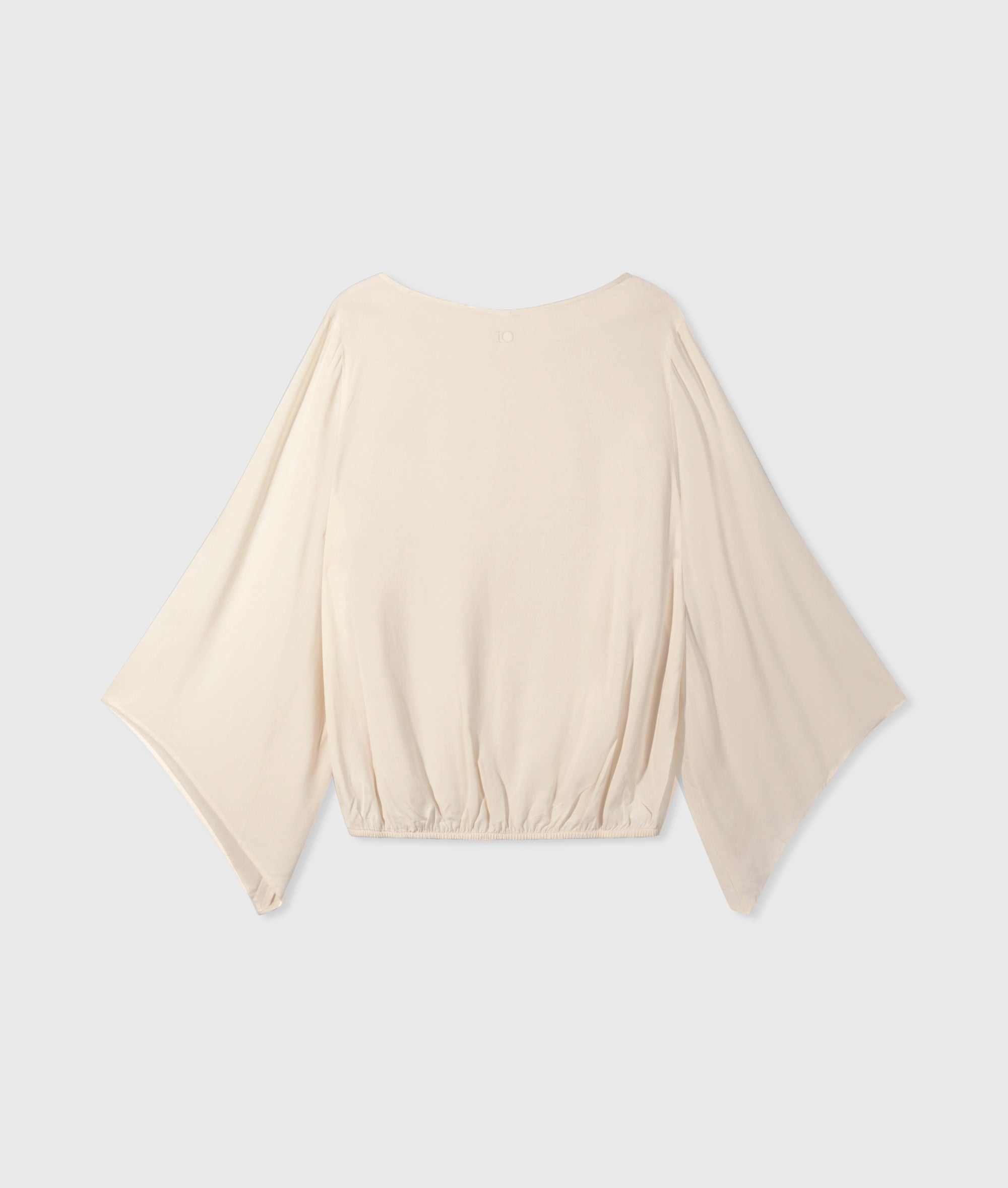 Regular fit flowy blouse made of shiny viscose. Featuring slanted, flared sleeves, a wide round neck, an elasticated hem and a '10' monogram embroidery on the back.