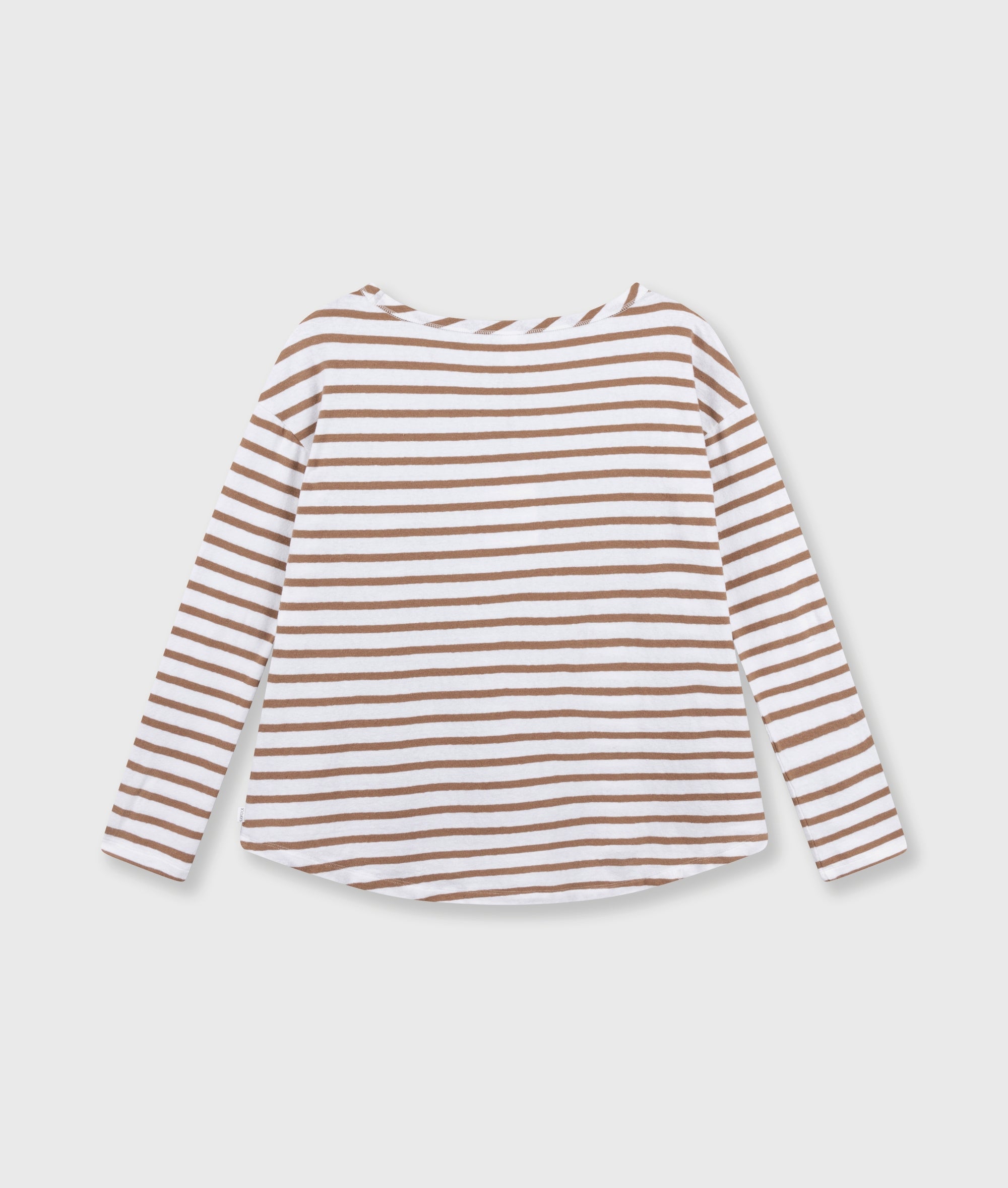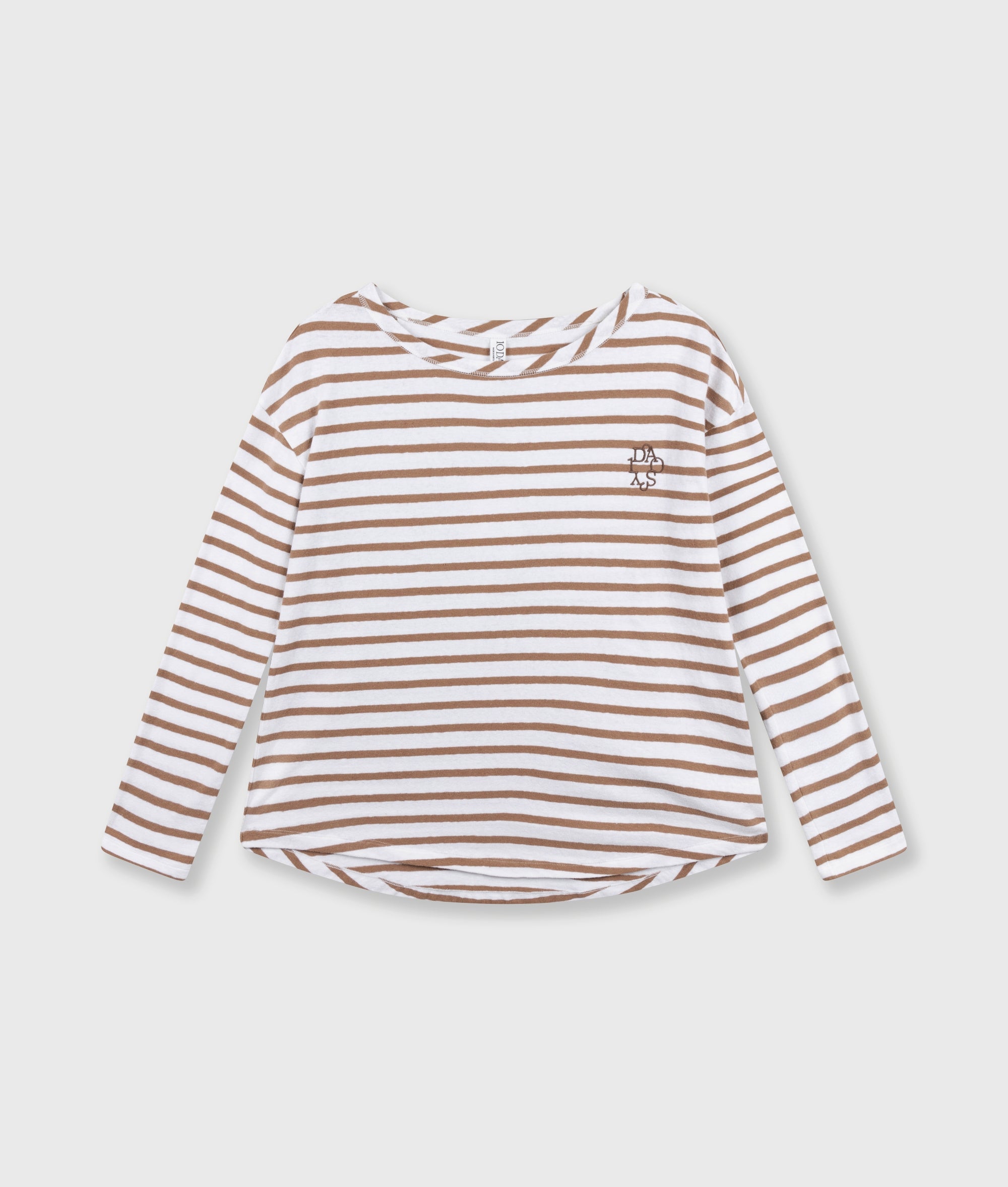 Relaxed fit striped long-sleeve shirt, made from a cotton and linen blend. Features a round neckline, dropped shoulders, and a 'curly 10' embroidery on the left chest.