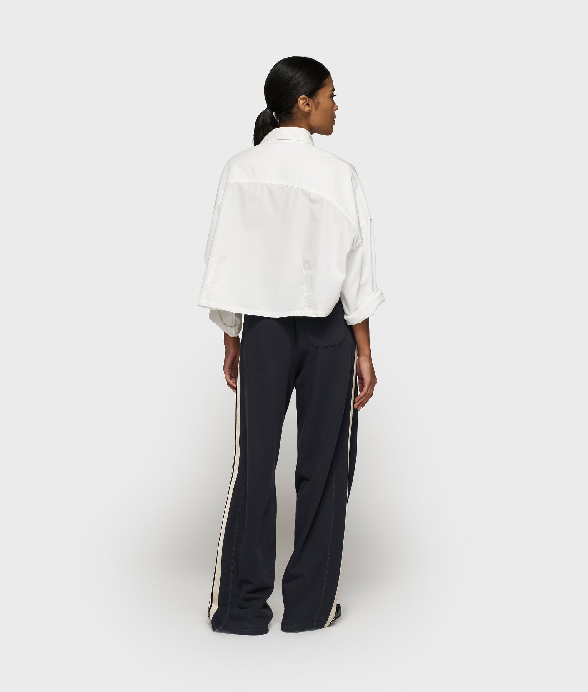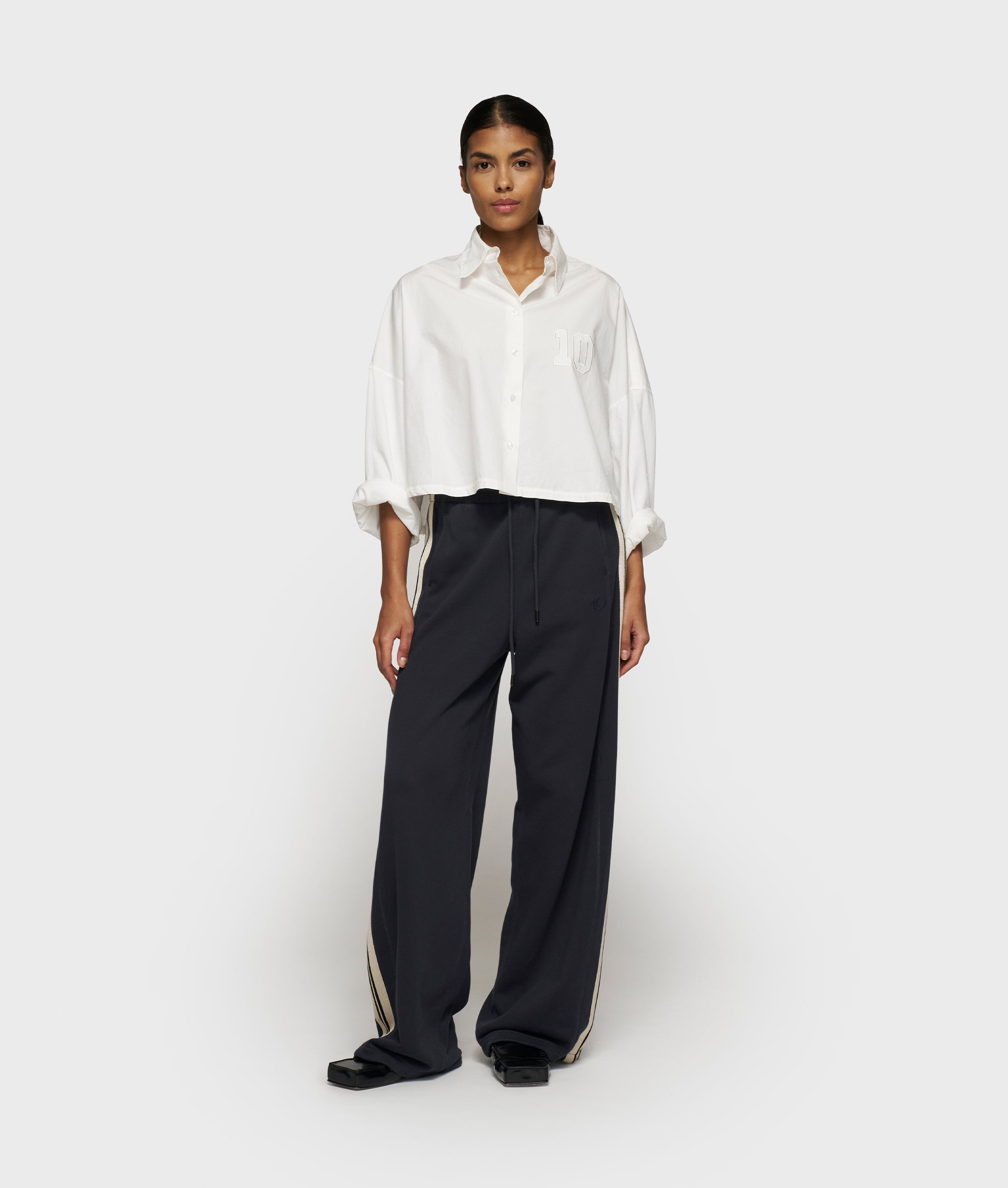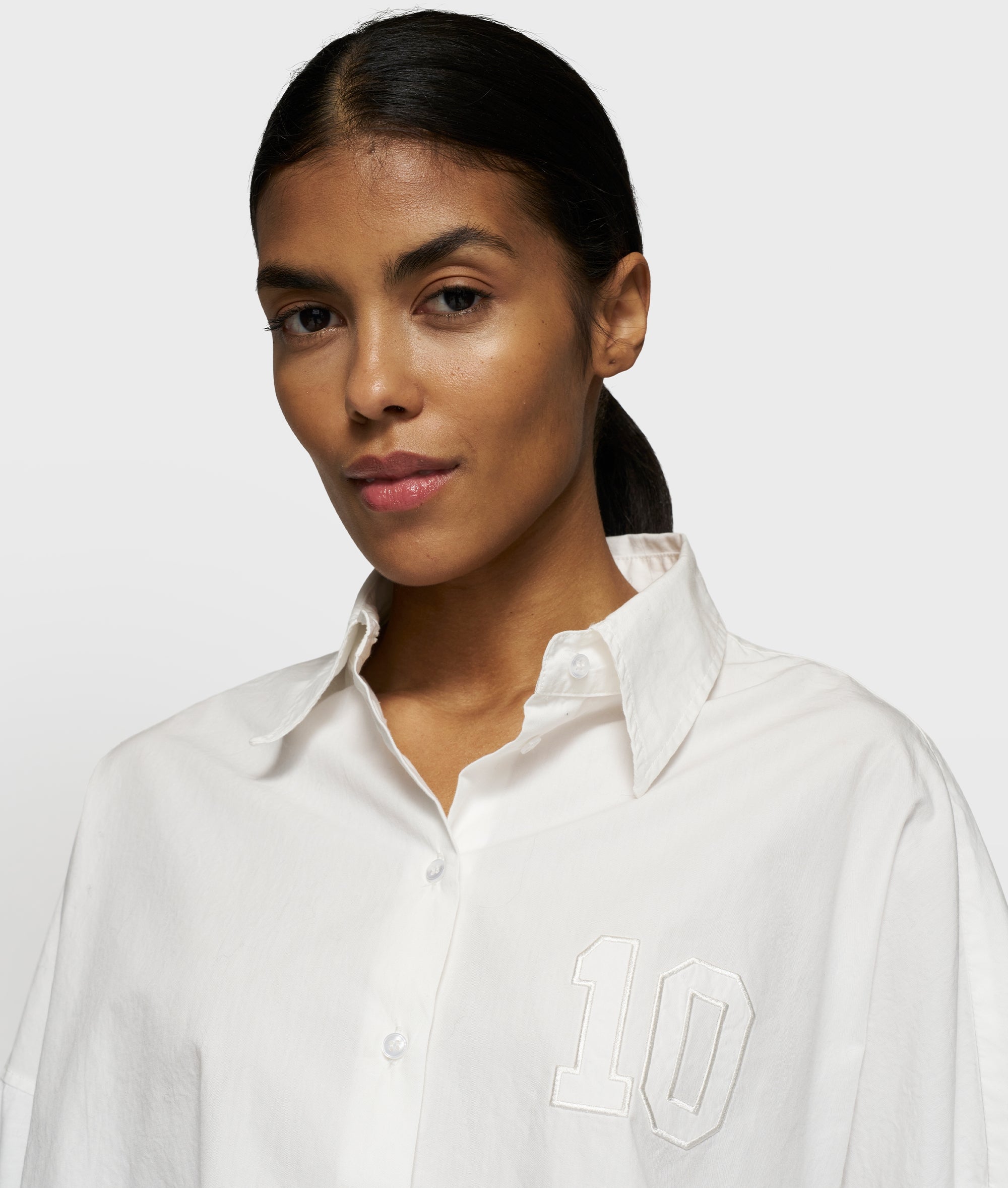 Oversized fit cropped shirt, made from GOTS-certified organic cotton twill for the body and dry jersey sleeves. Features a collar with button closure, a round hem that is longer at the back, rolled sleeves, a feston 'baseball 10' on the front and a '10' monogram embroidery on the left sleeve.