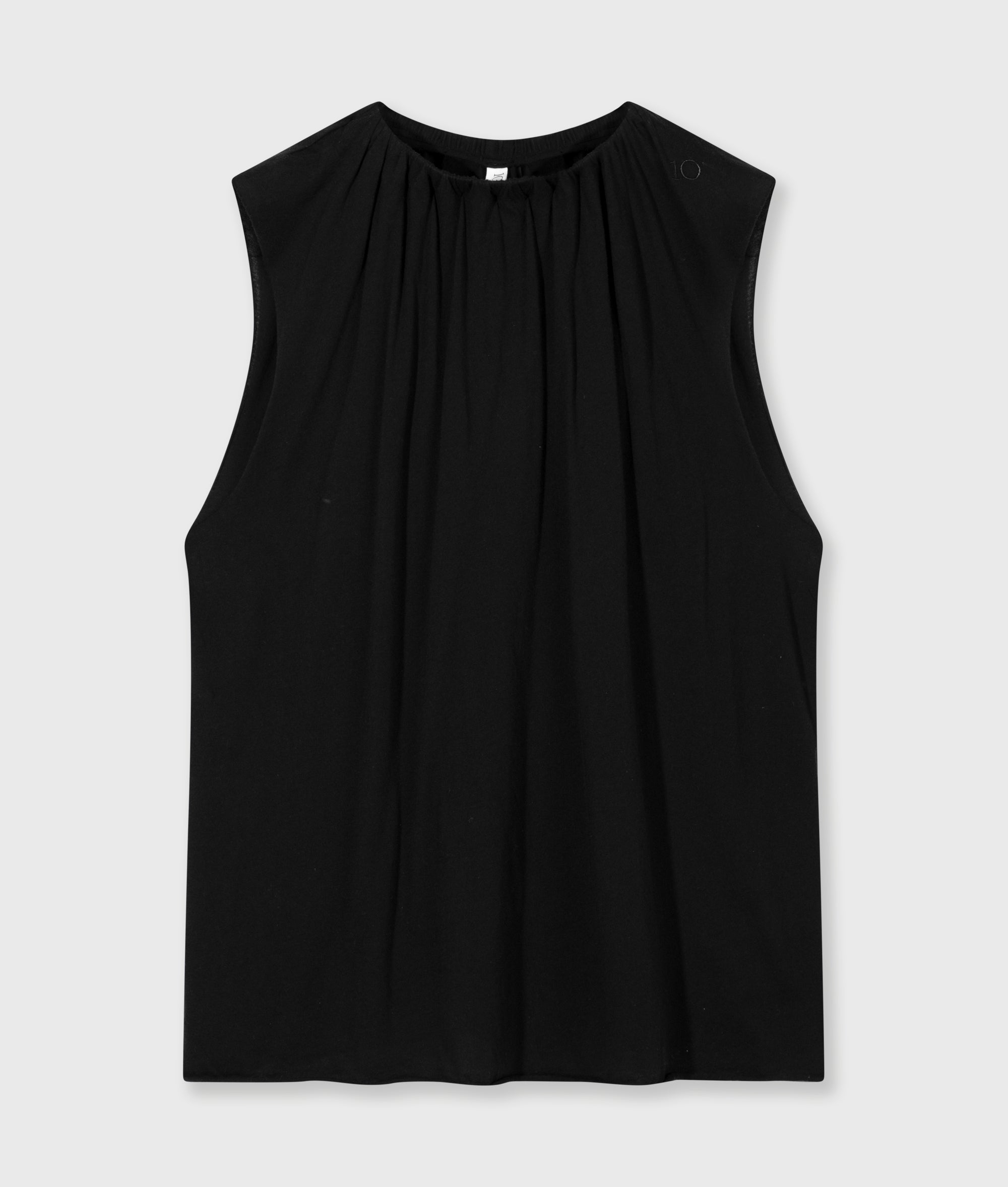 Relaxed fit sleeveless top, made from lightly textured GOTS-certified organic cotton jersey. Designed with a round elasticated neckline with pleats, raw-edge finishes at the armholes and hem, a small label in the side seam and a ‘10’ monogram embroidery on the shoulder.