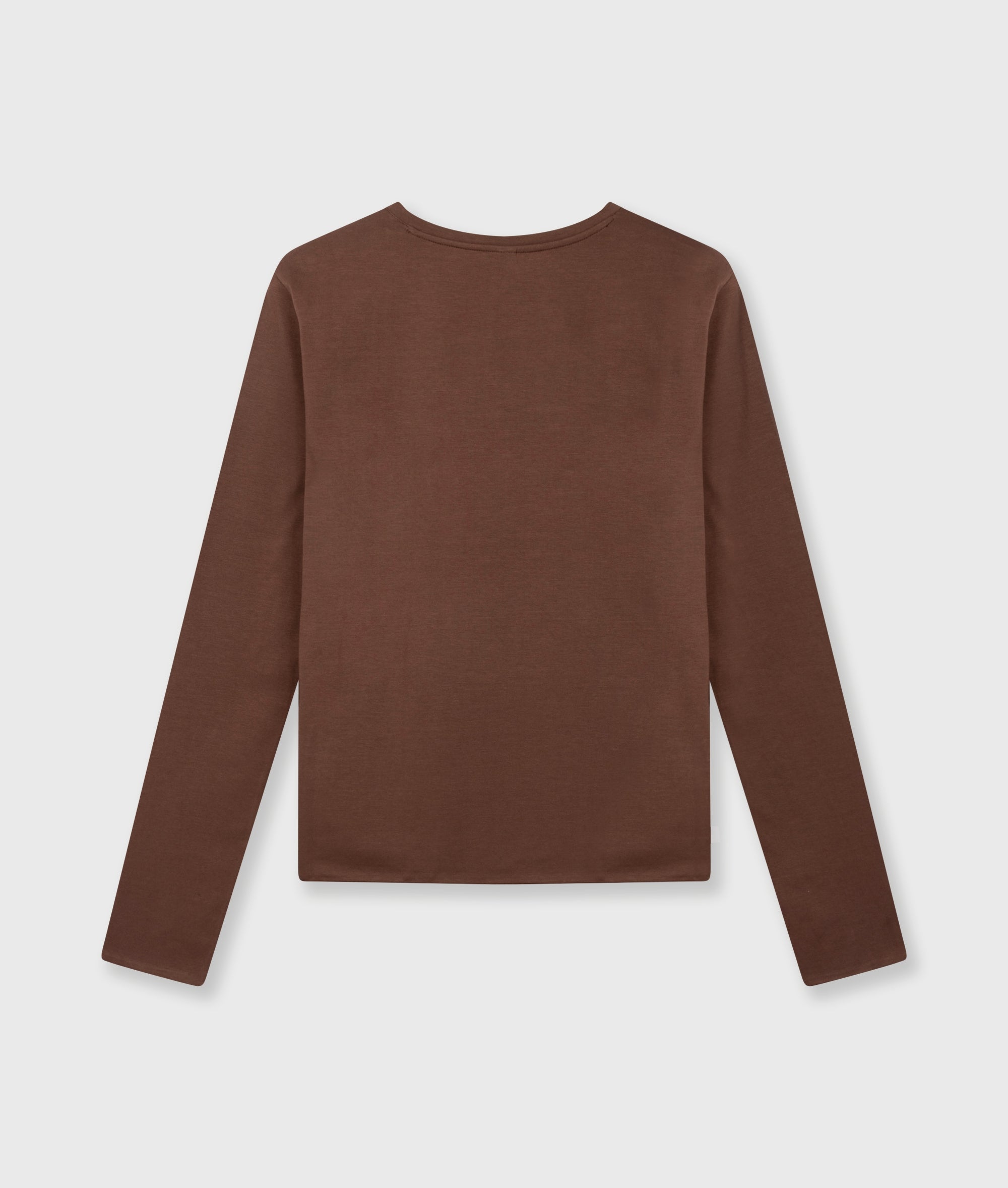 Slim fit long-sleeve top, made from soft GOTS-certified organic cotton. Features a round neckline, raw edge hem and cuffs, and a 'curly 10' embroidery on the chest.