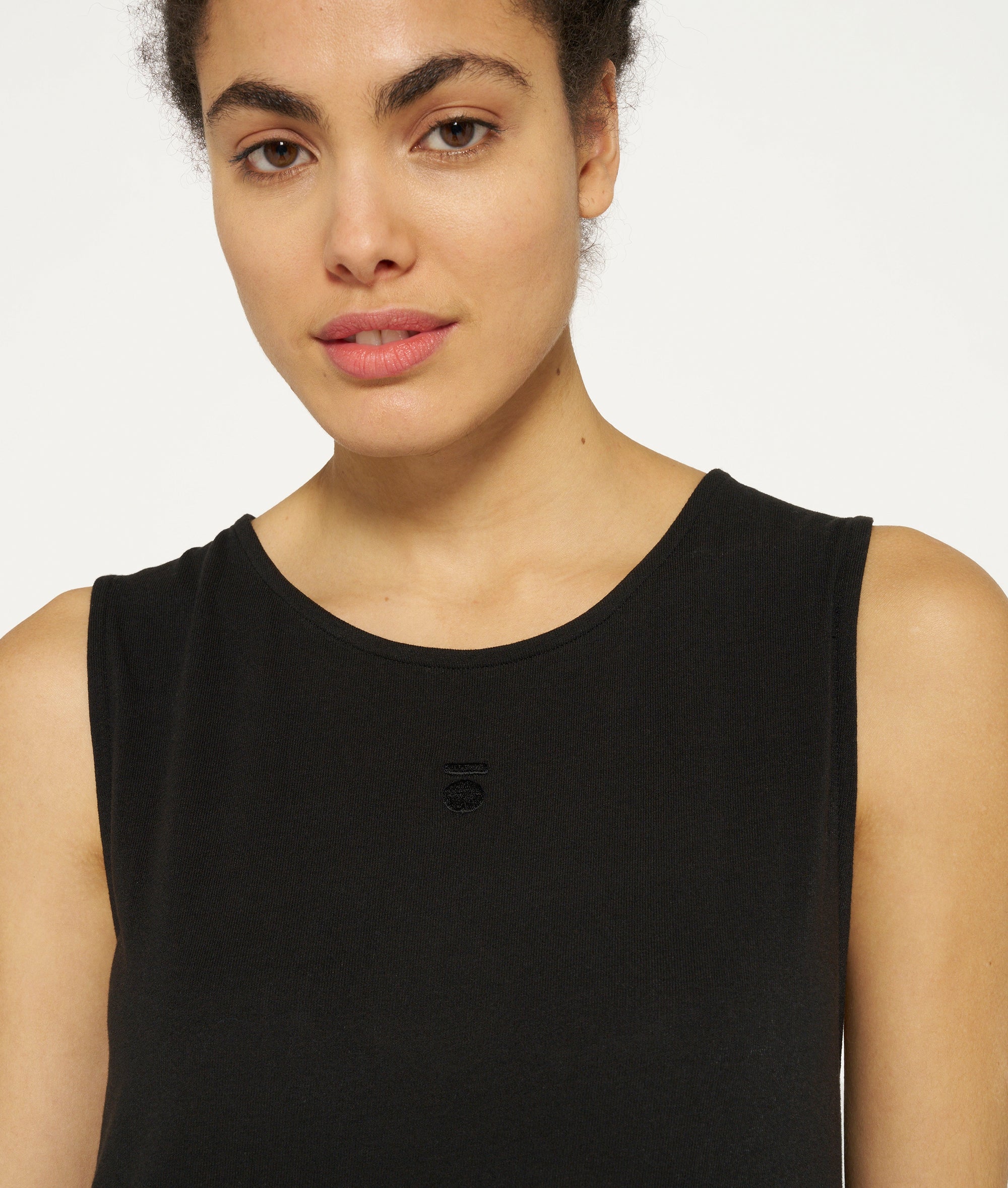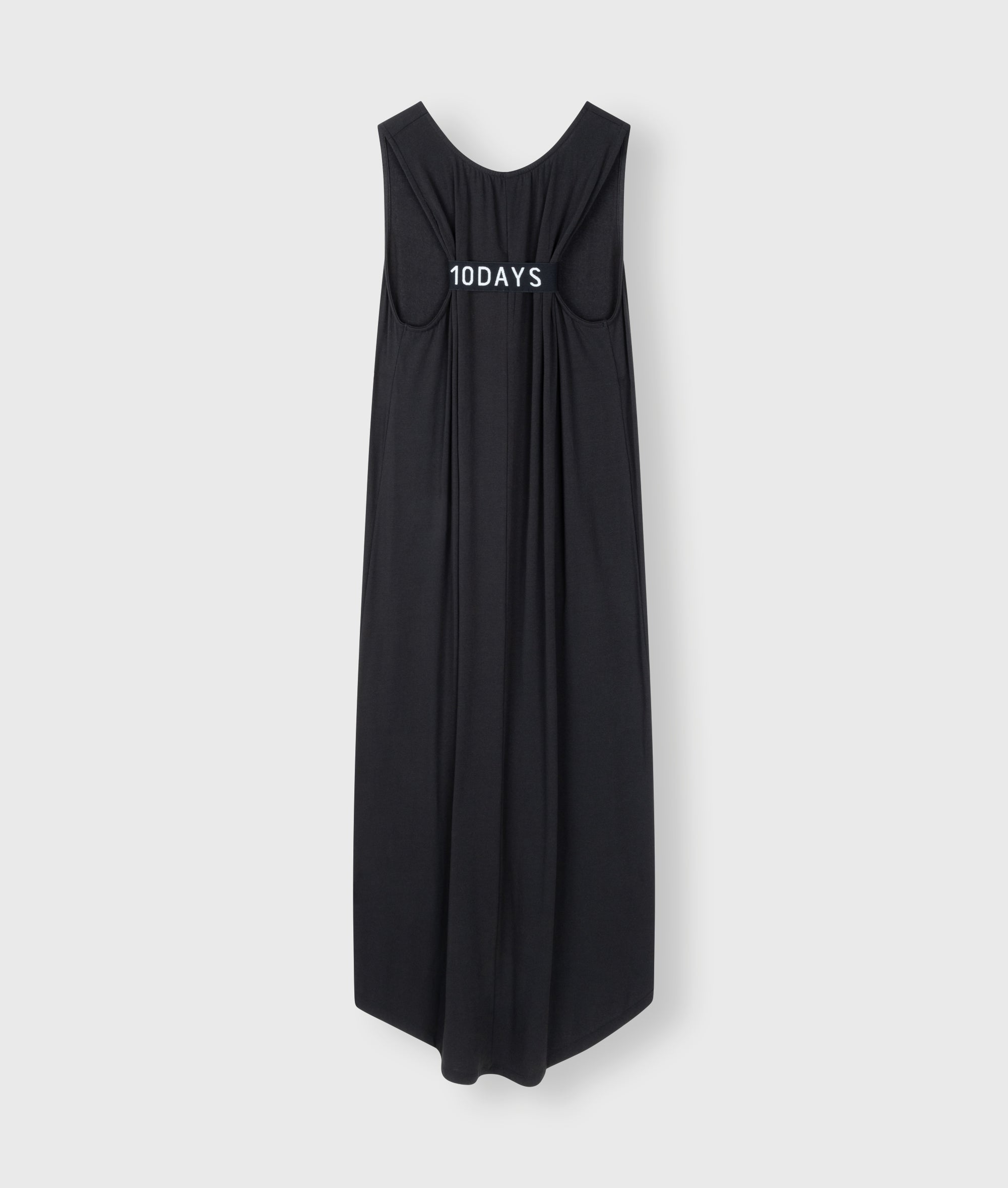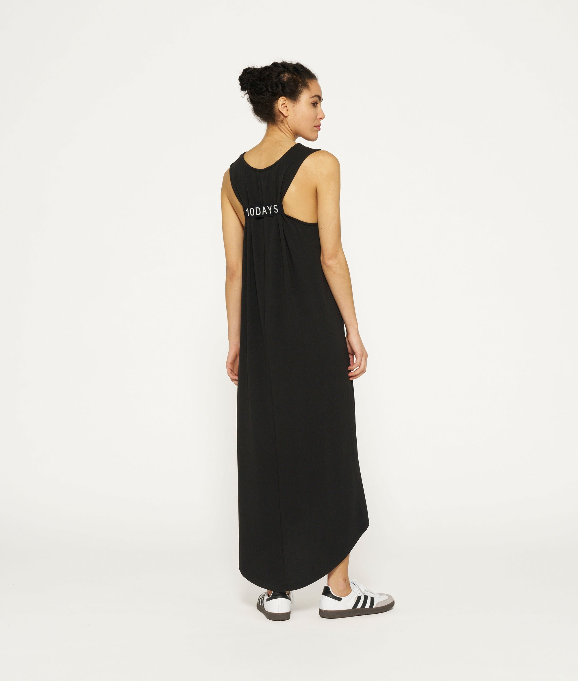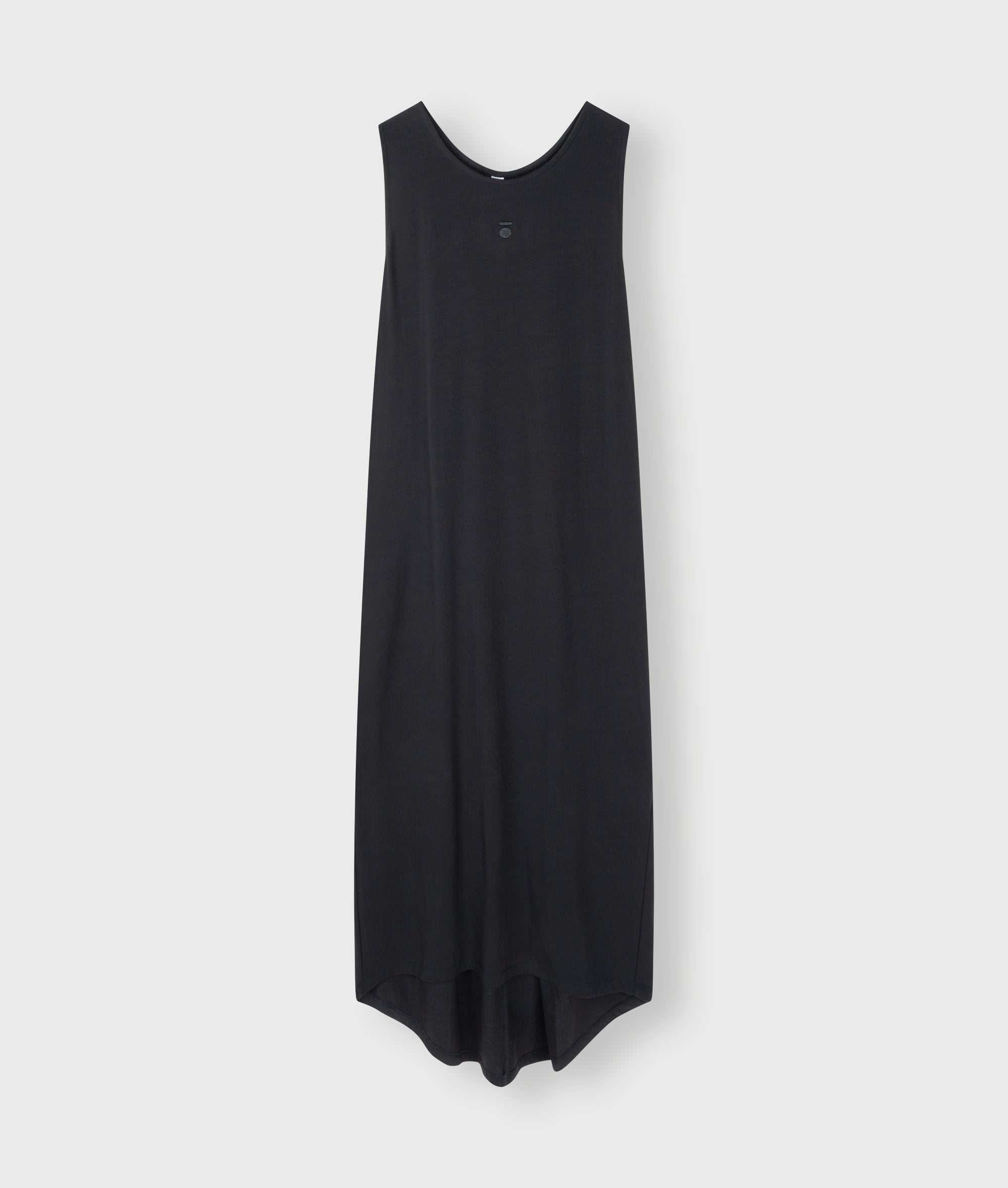 Relaxed fit midi dress with pleated back, made from super soft modal jersey. Features a round hem that is longer at the back than the front, a medal logo embroidery on the chest and an elastic band on the back at the pleat detail.
