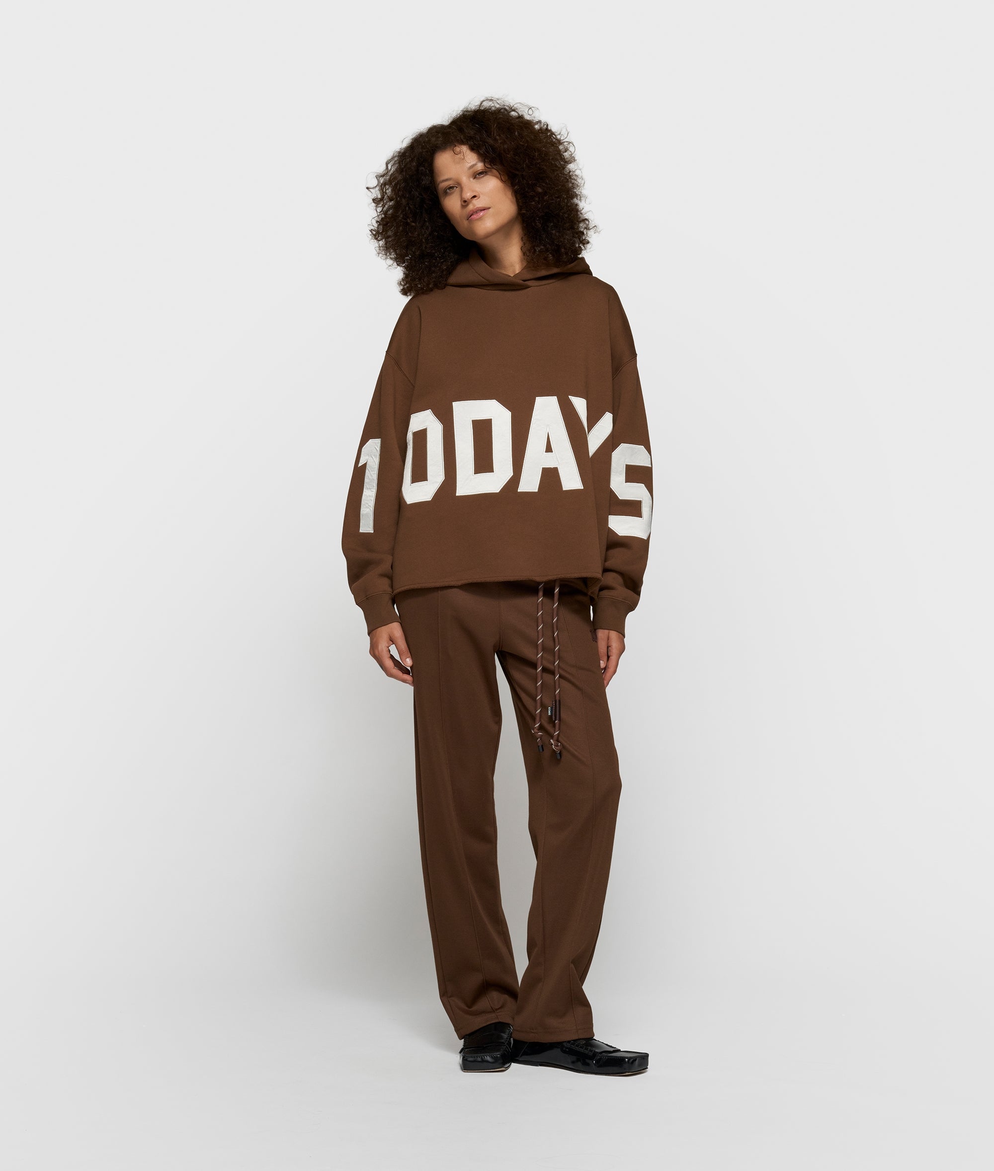 Oversized fit statement hoodie, made from thick brushed fleece. The sweater features a large 10DAYS logo patch on the sleeves and front body, a hood, ribbed cuffs, and a raw edge hem.