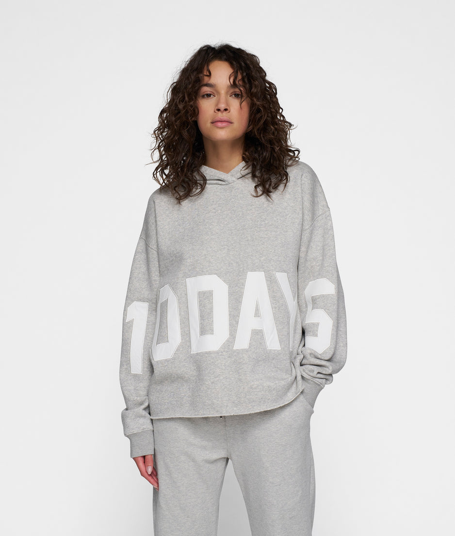 Oversized fit hoodie made of a thick brushed cotton and polyester. The sweater features a large 10DAYS logo patch on the sleeves and body on the front, a hood, ribbed cuffs and a raw edge hem.