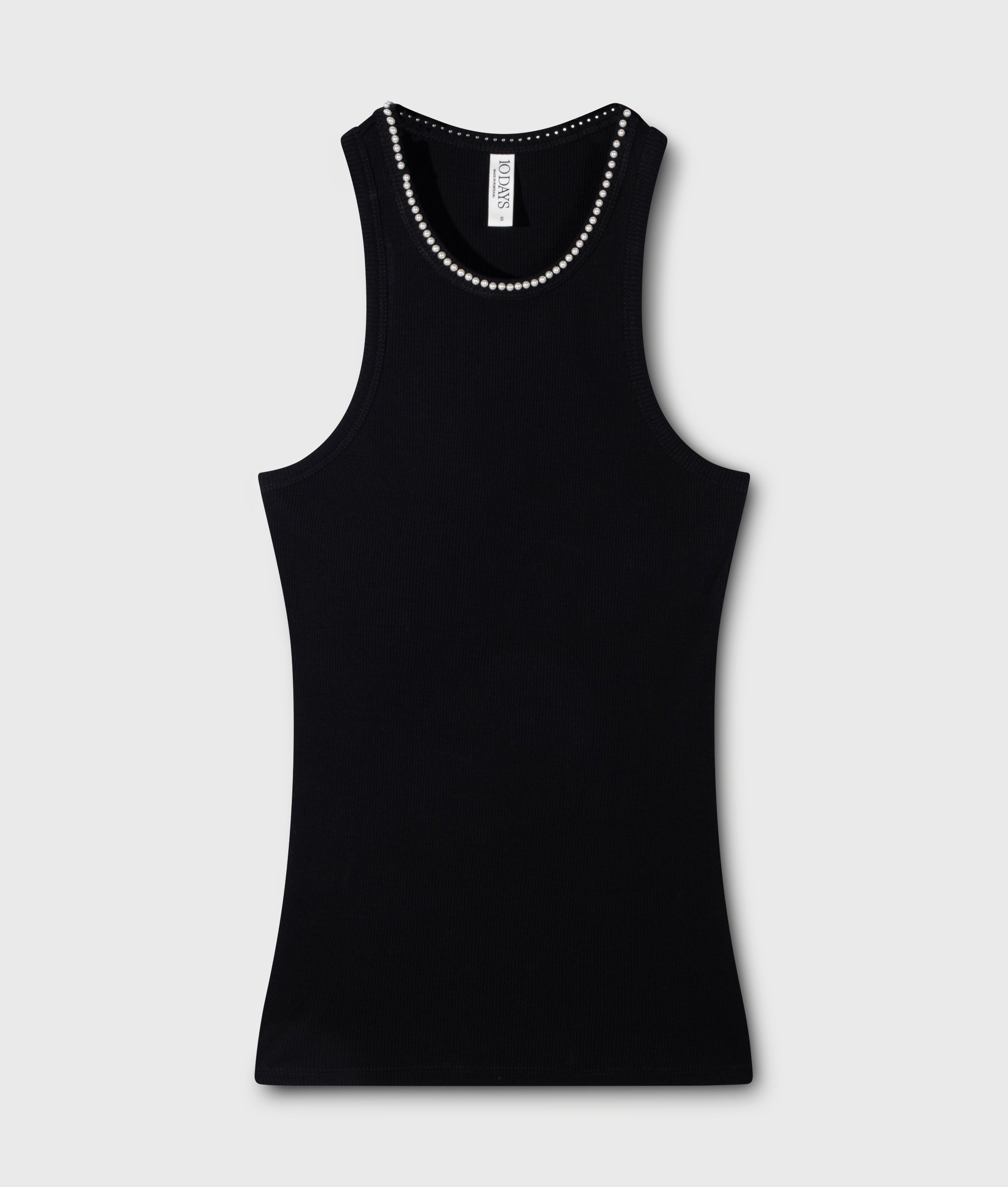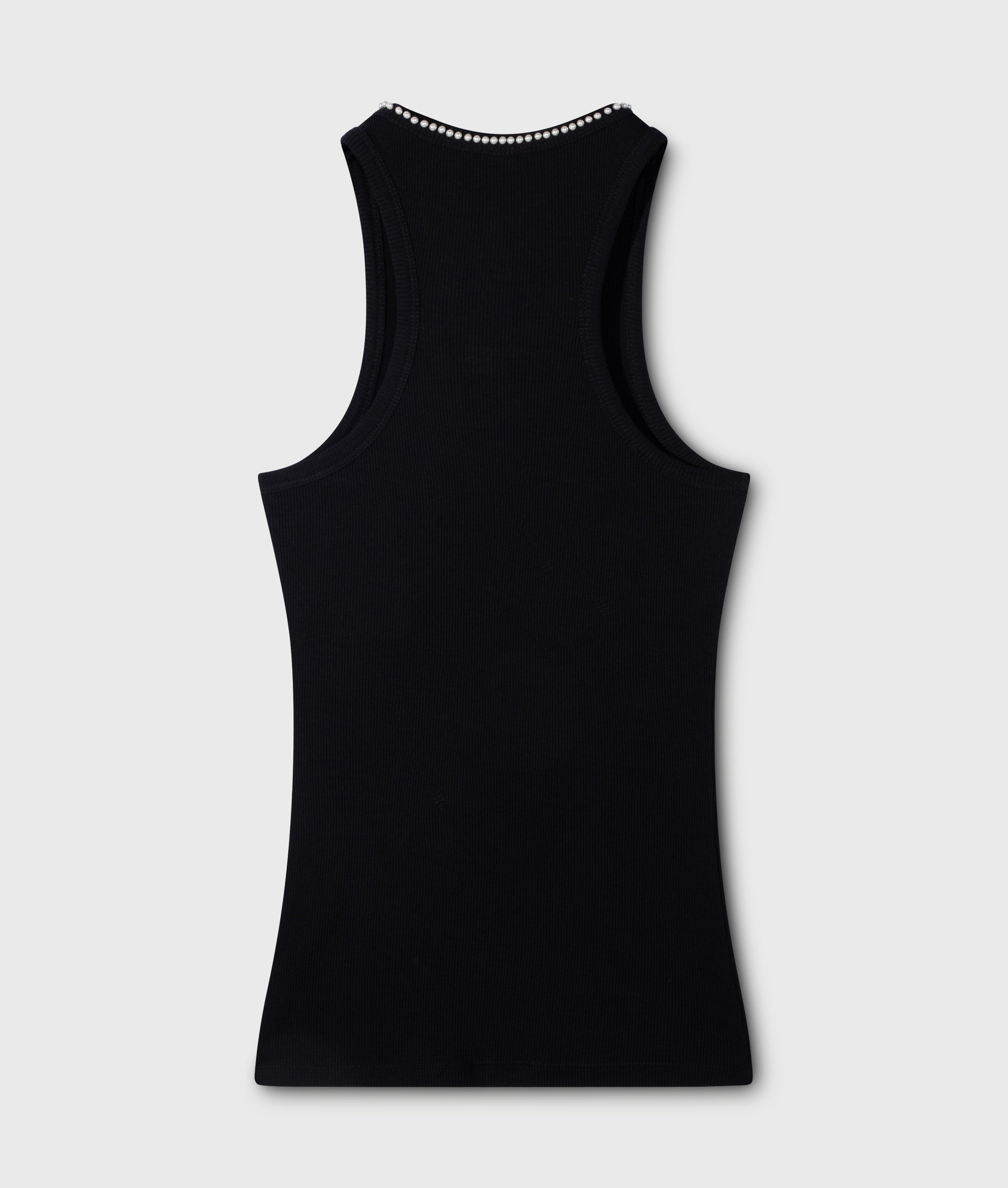 Slim fit tank top, made of soft cotton rib jersey. Features a ribbed neckline with pearls all around and a small mini stripes label along the left side seam.