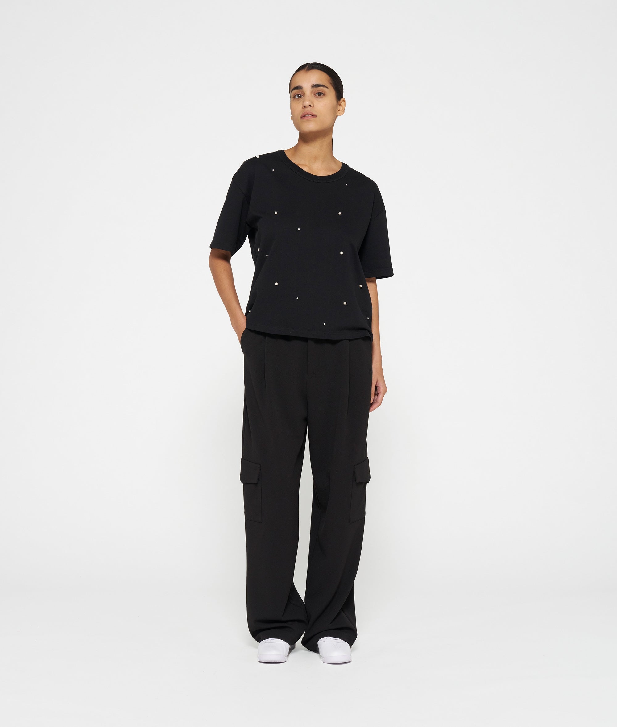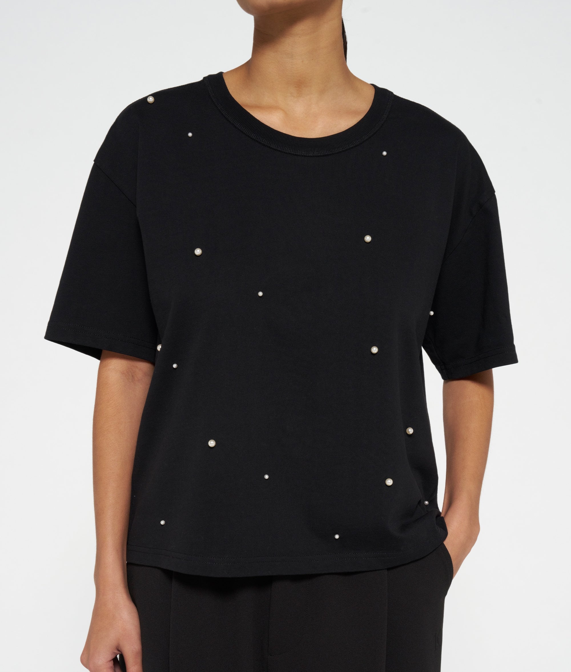 Relaxed fit T-shirt in thick cotton jersey with stitched pearls on the front and on the sleeves. Features a round ribbed neck, mini stripes embroidery on the back and a small medal label in the left side seam.