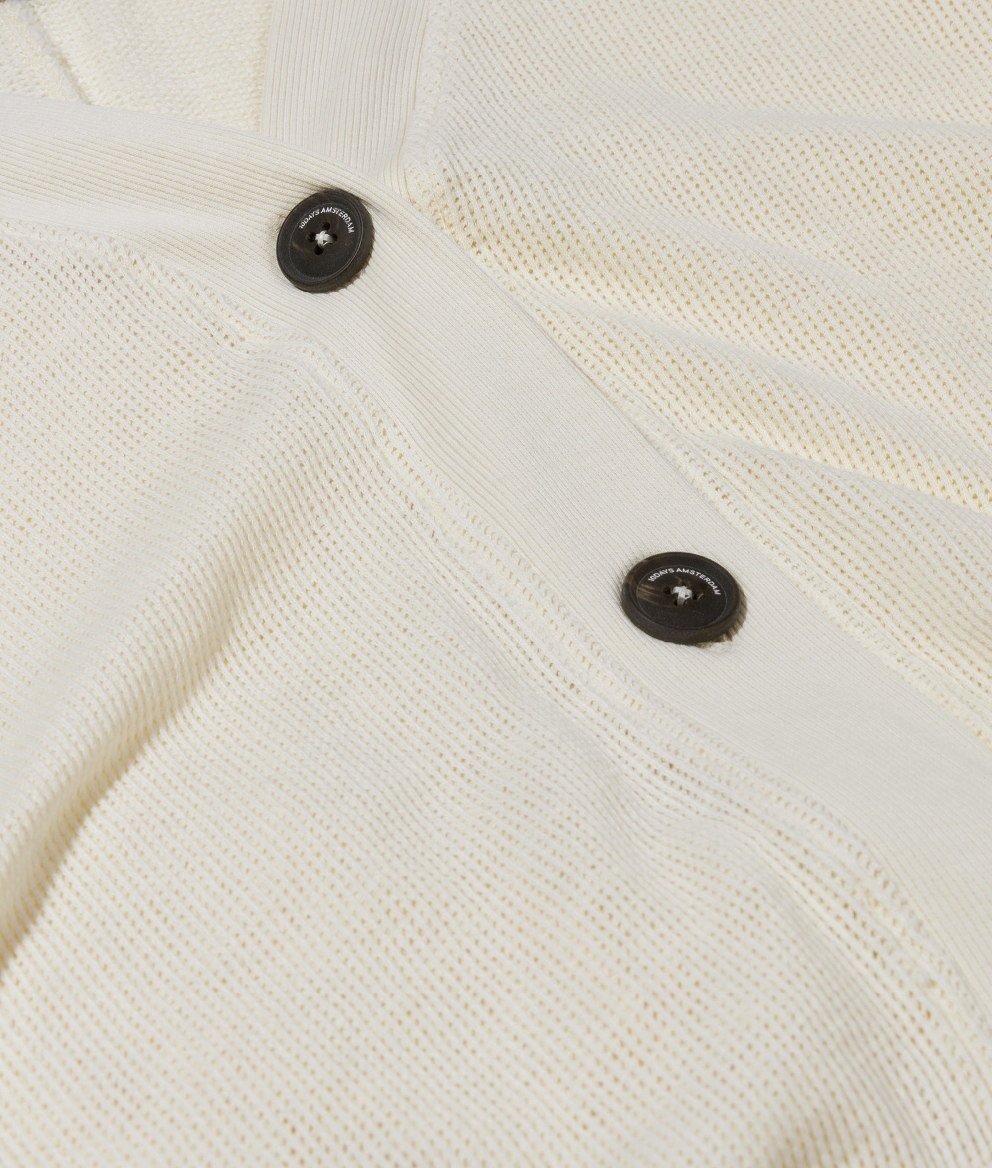 Oversized fit cardigan, made from soft GOTS-certified organic cotton mesh. Designed with a deep V-neck, rib-knitted trims and a button fastening with three buttons.