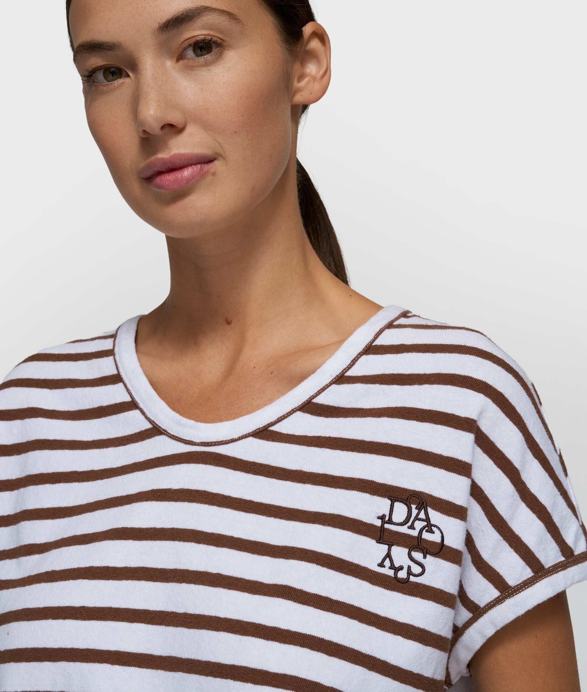 Relaxed fit striped shirt, made from a soft cotton-linen blend. Features a V-neckline and a 'curly 10' embroidery on the left ches