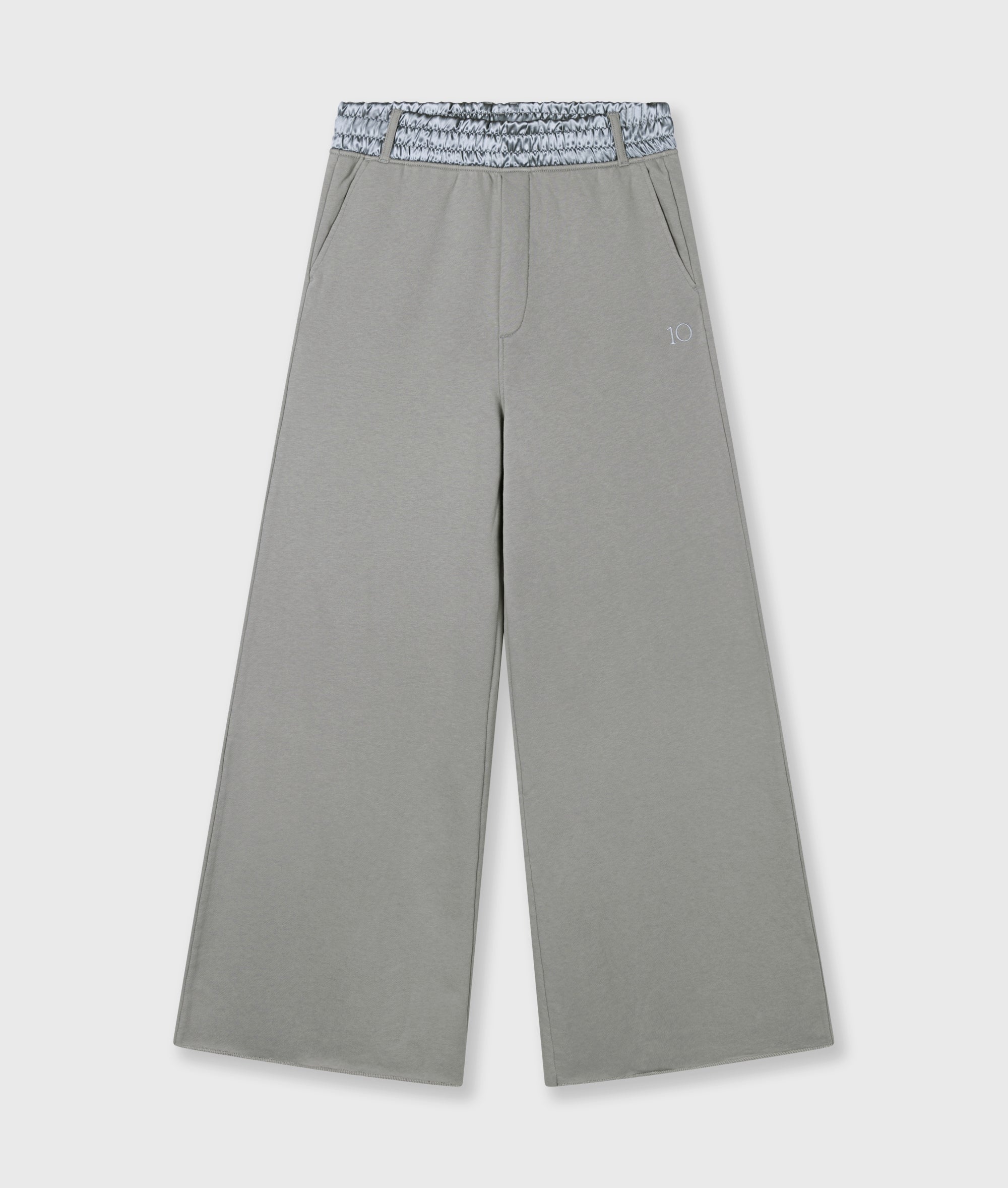 Regular fit wide-leg joggers, made from soft cotton and polyester. Features a satin elasticated waistband with belt loops, side pockets, and a '10' monogram embroidery beneath the left pocket.