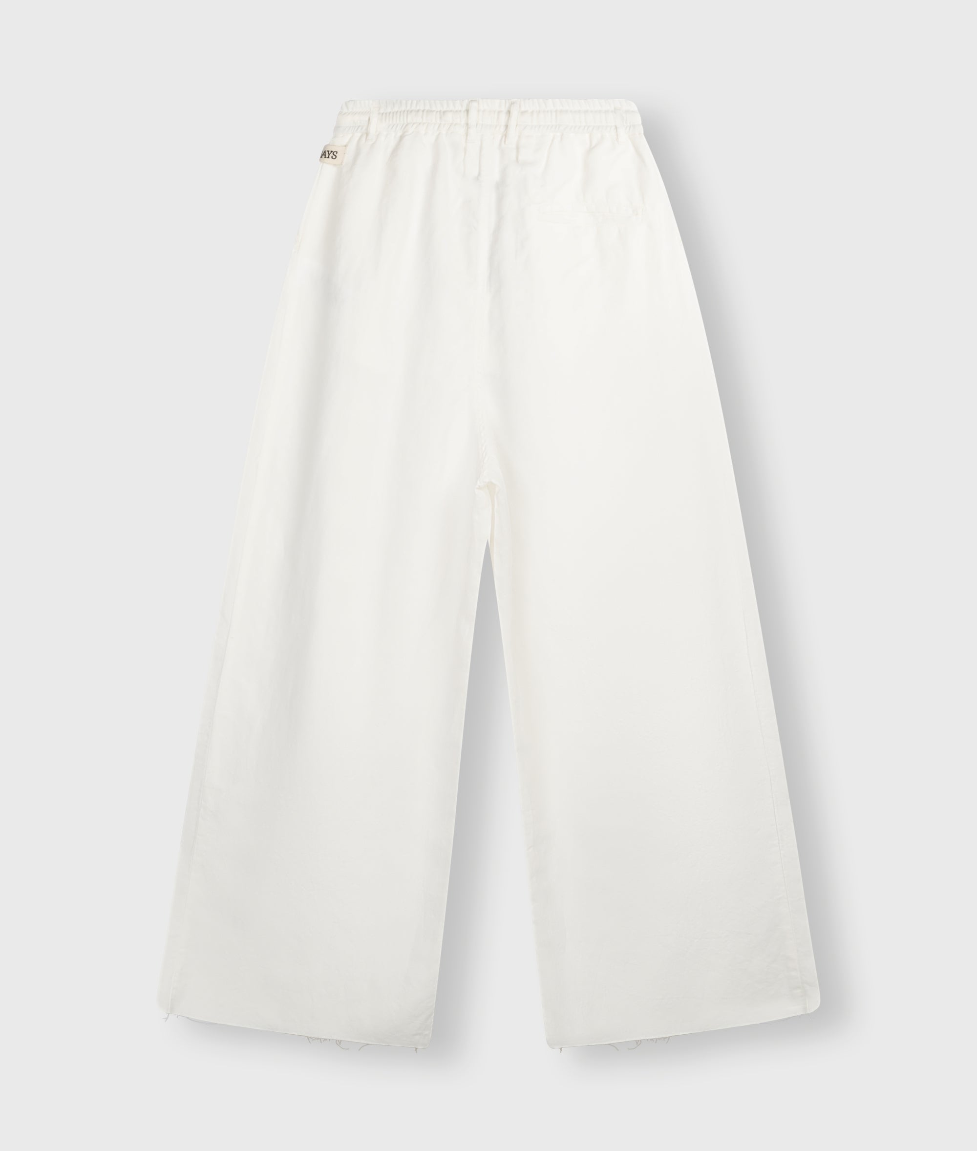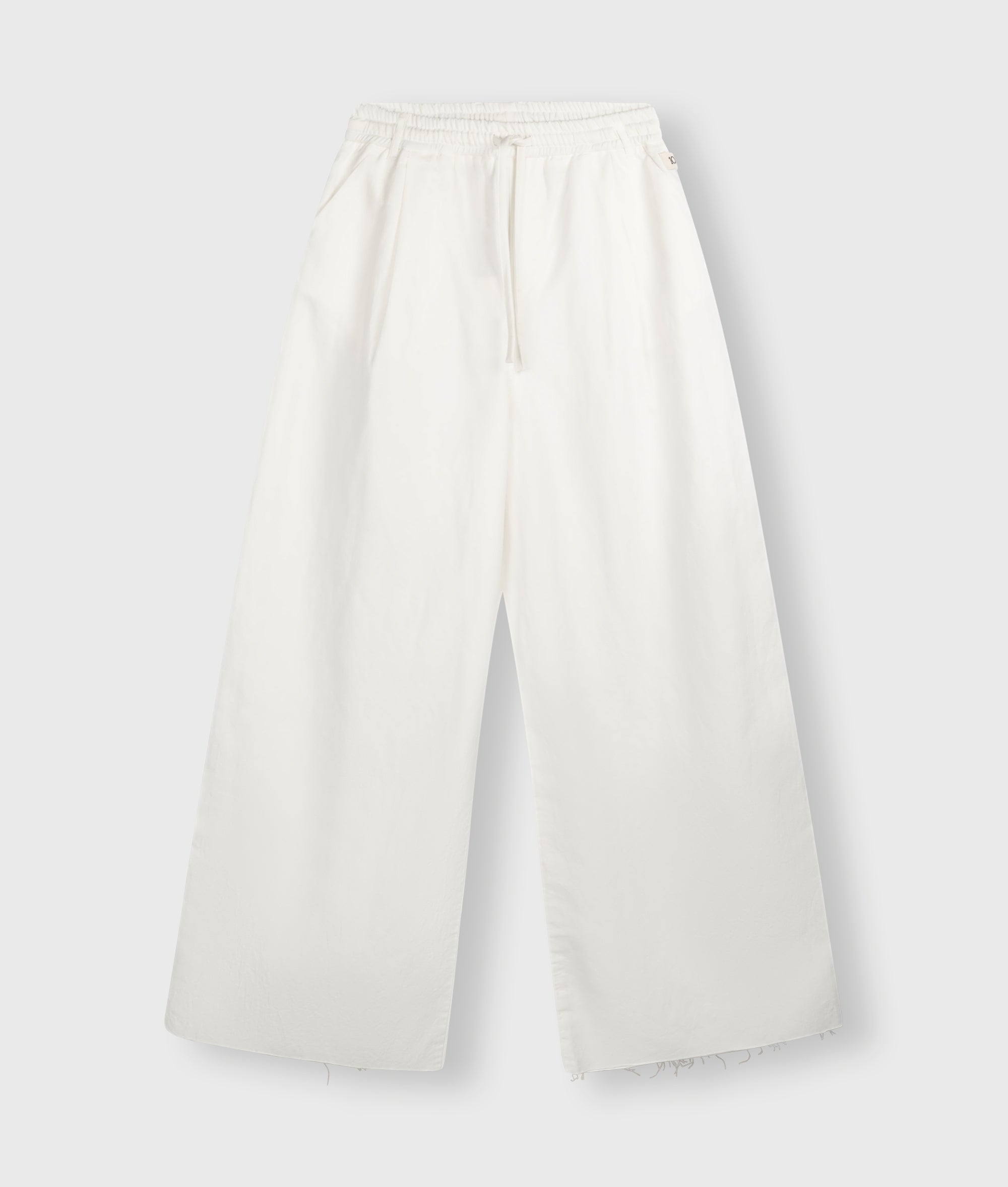 Relaxed fit wide-leg pants made from a cotton and linen blend. Features an elasticated jersey waistband with jersey drawstring and belt loops, slanted side pockets, a label above the left side pocket, a medal embroidery under the left side pocket and a double welt pocket on the back.