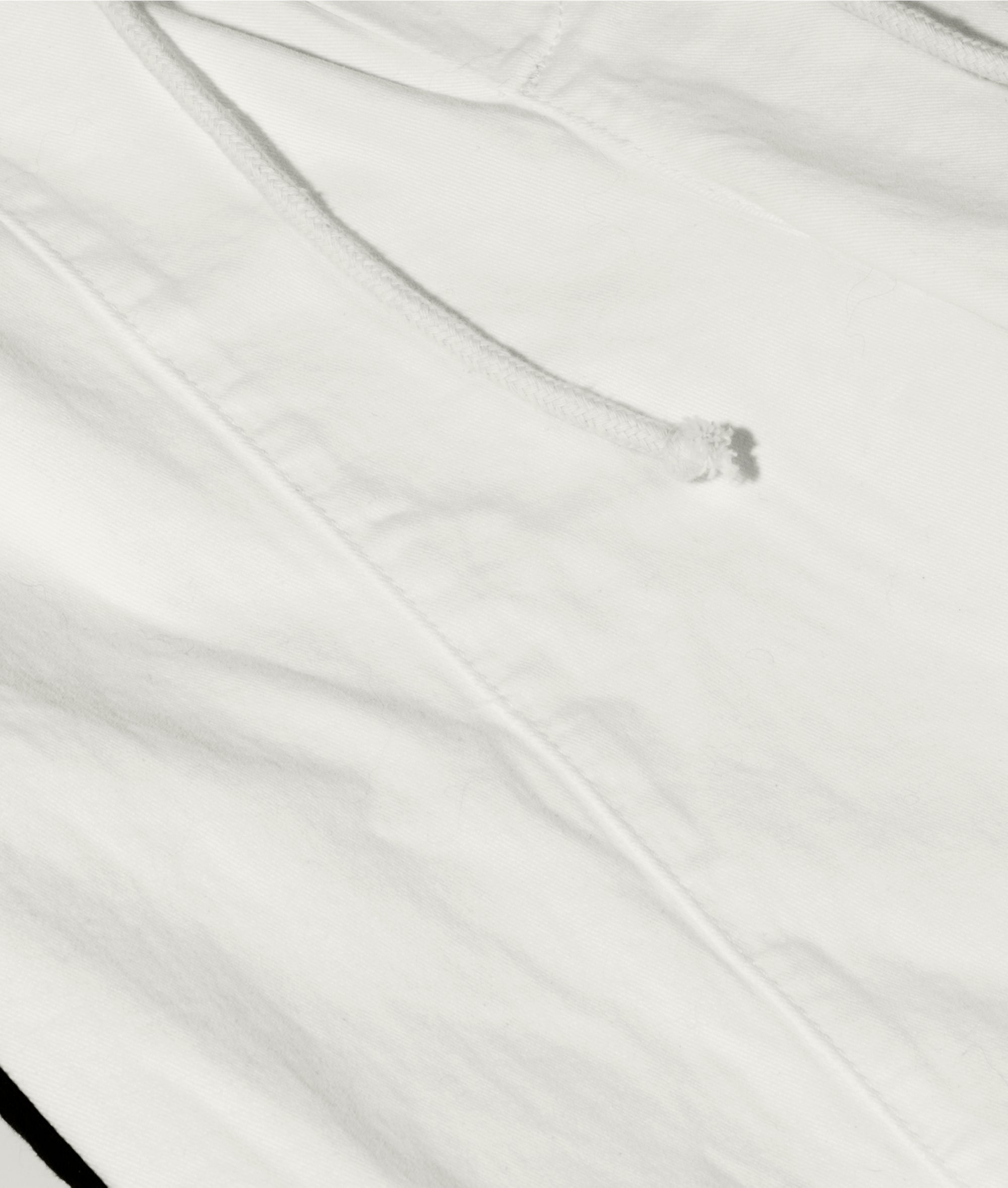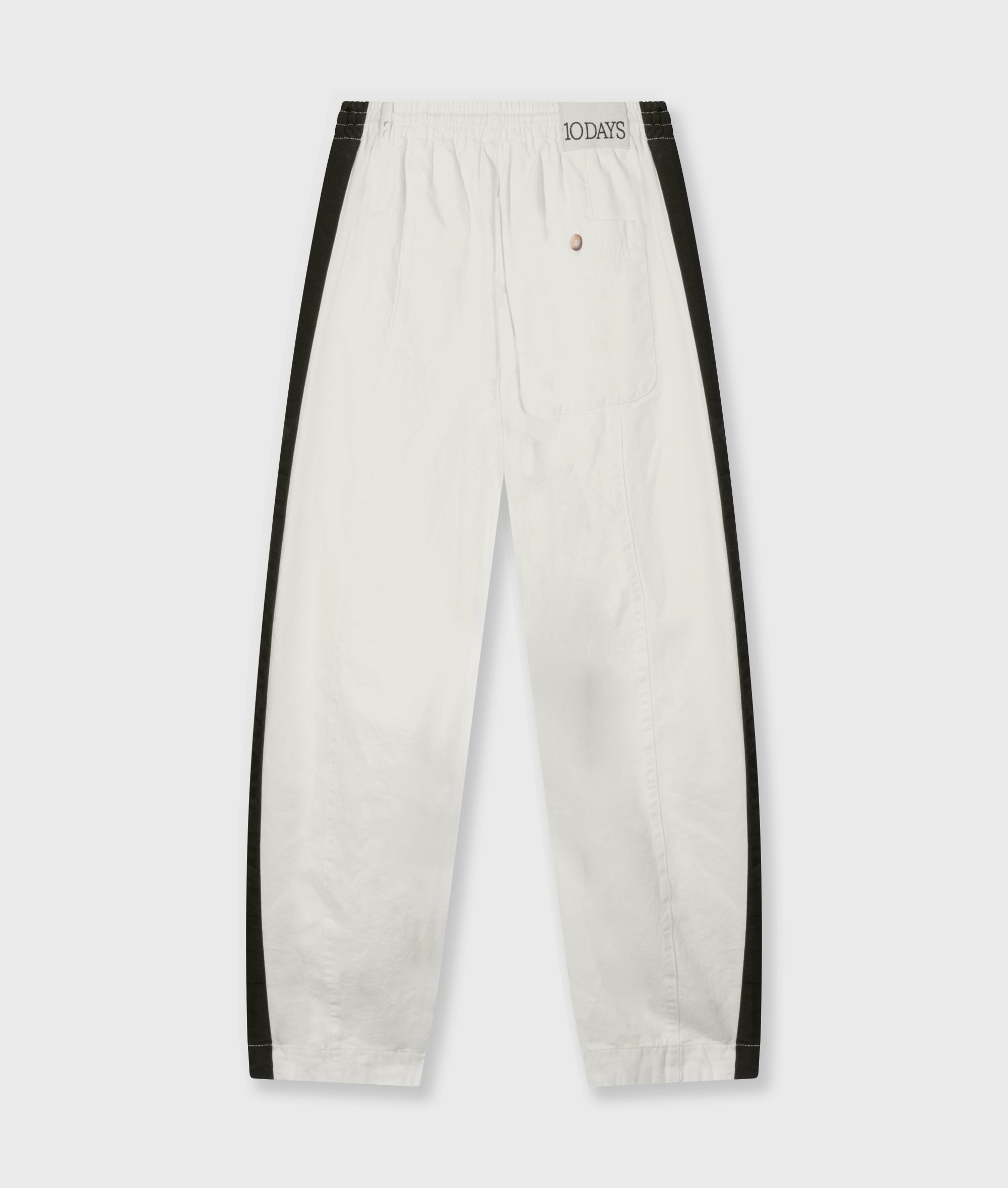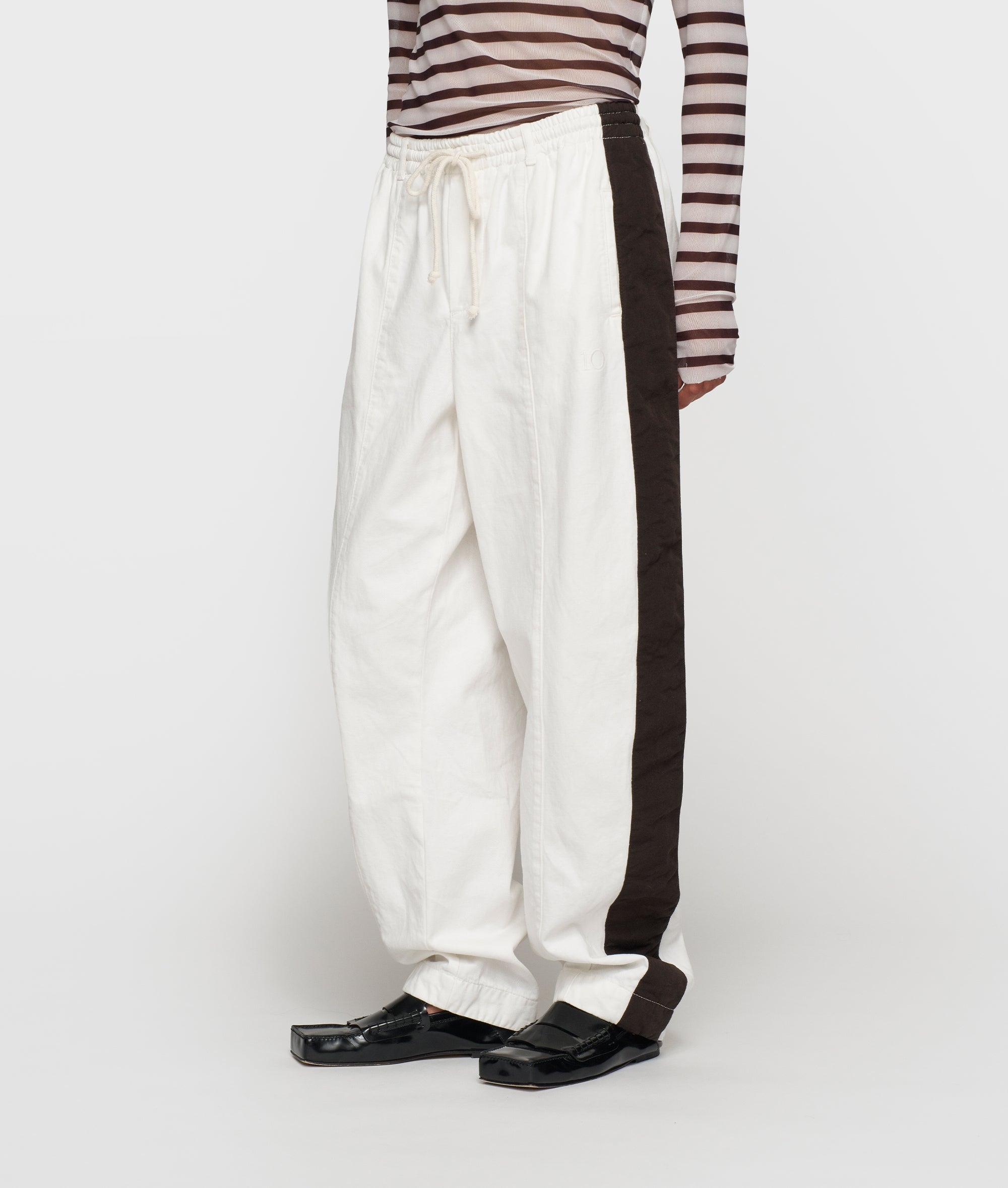 Relaxed fit mid waist pants made from GOTS-certified organic cotton. Features an elastic waistband with drawstring, slanted side pockets, tape details along the side seams, a patch pocket at the back, and a '10' monogram embroidery below the left pocket.